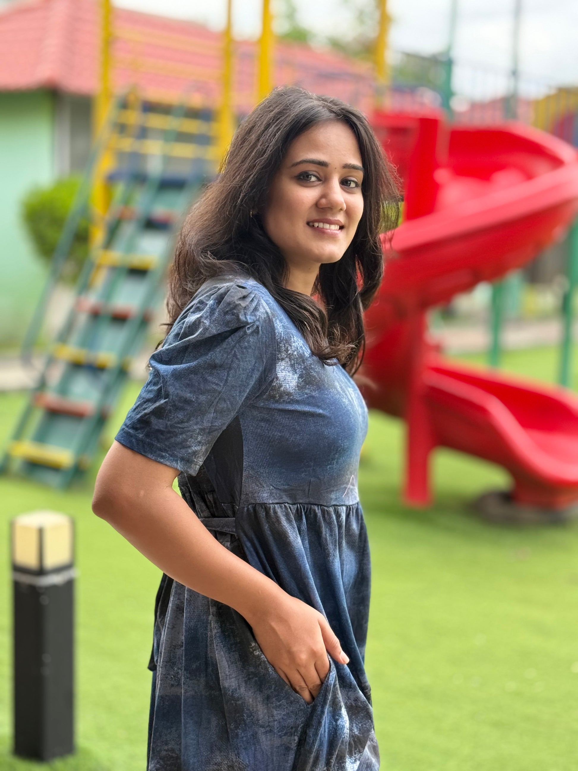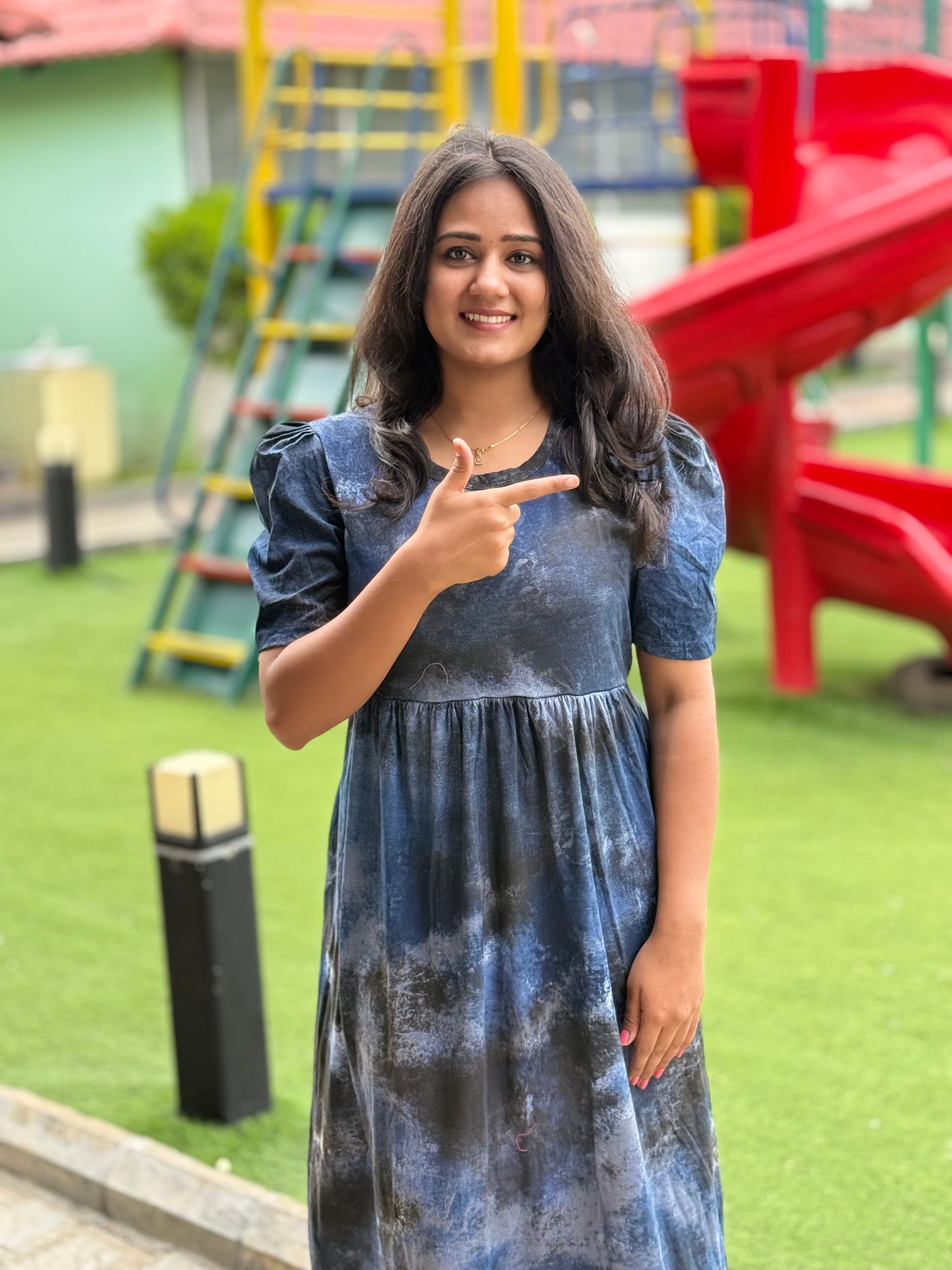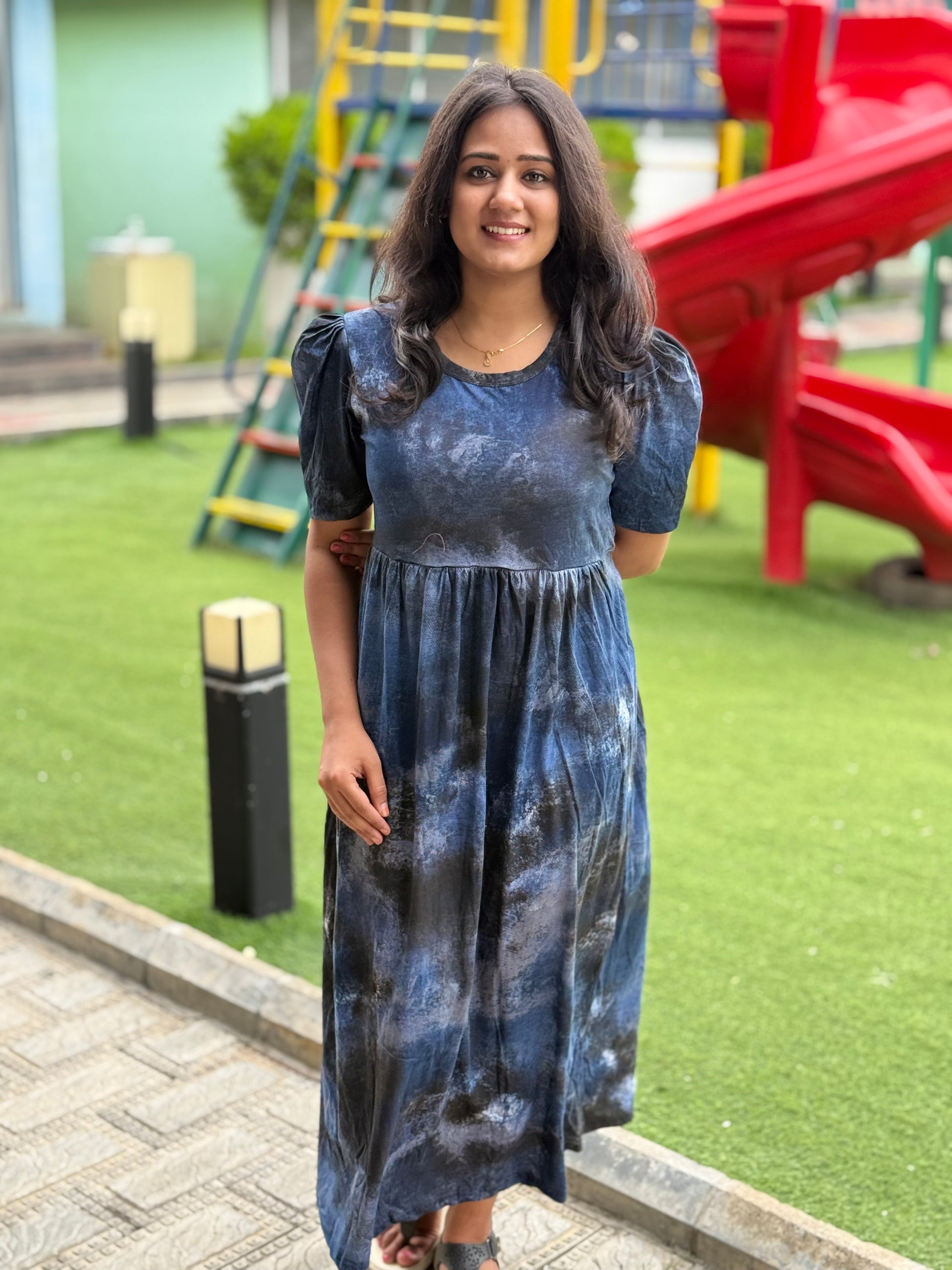 PUFF TYPE MAXI COTTON LOUNGE WEAR WITH ACID SHADED NAVY